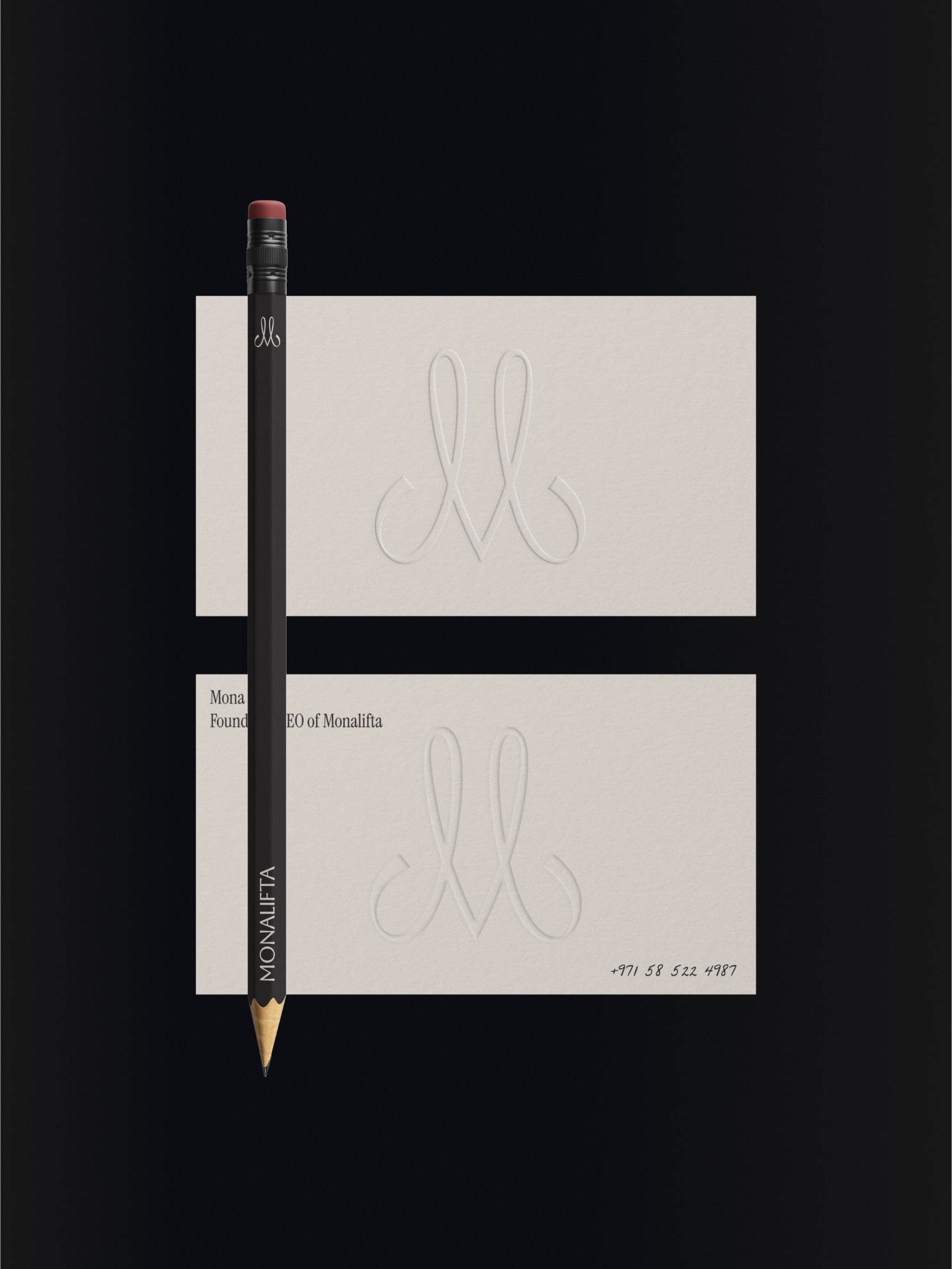 The brand persona mirrors Mona. Sharp. Edgy. Strong. Feminine. Loyal. Disciplined. Respectful. The M monogram blends these traits in a modern, minimal mark.